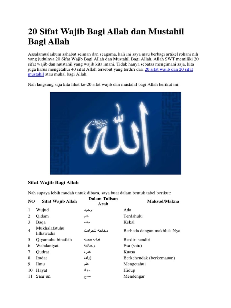 Tabel 20 sifat wajib allah dan artinya arabnya lengkap +pdf !